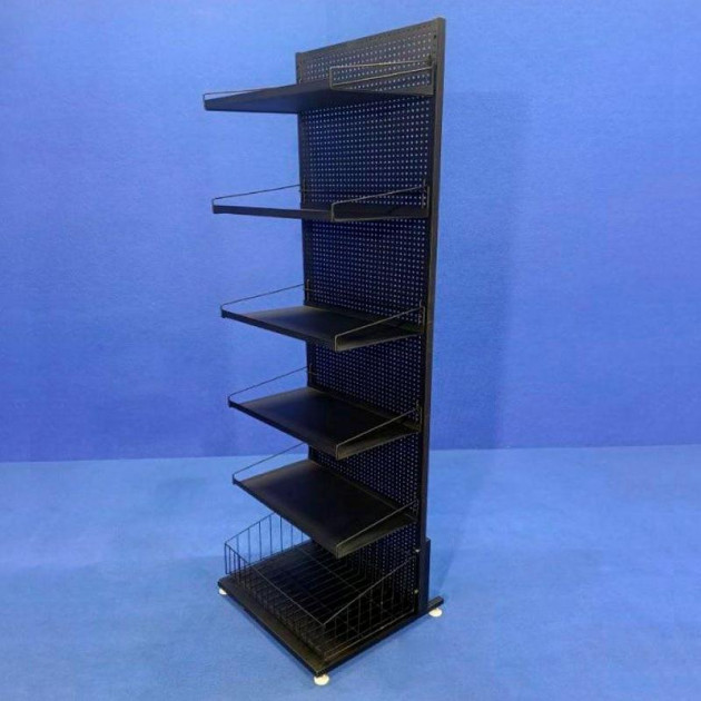 Торговий перфорований стелаж — універсальне і практичне рішення для розміщення широкого асортименту товарів у торговому залі. Конструкція включає 5 полиць і один місткий глибокий кошик, що дозволяє зручно комбінувати викладку товарів різного формату і розміру.