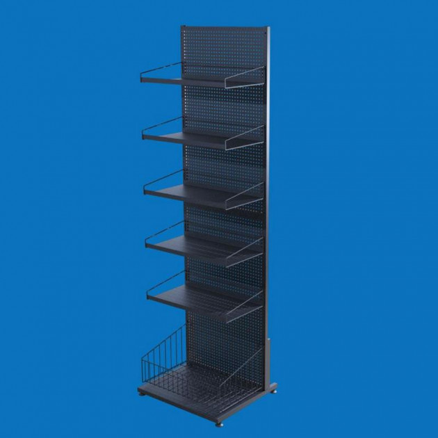 Торговий перфорований стелаж на 5 навісних полиць і глибоким кошиком (50×185 см, чорний, розбірний)