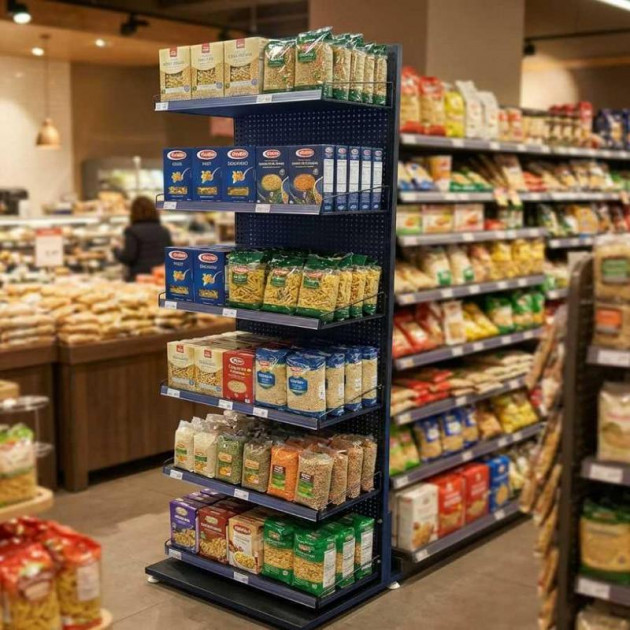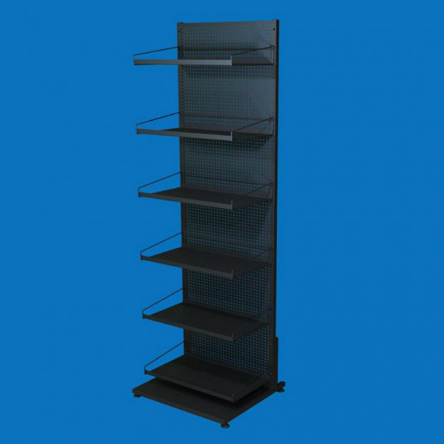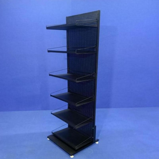 Торговий перфорований стелаж — універсальне і практичне рішення для розміщення широкого асортименту товарів у торговому залі. Конструкція включає 6 полиць, що дозволяє зручно комбінувати викладку товарів різного формату і розміру.
