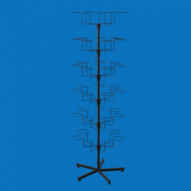 Стійка для головних уборів — чорна «Ромашка» Підлогова стійка на 5-променевій опорі з 6-ма обертовими ярусами на 42 кронштейни під шапки, кепки та інші головні убори. Стійка чорного кольору, компактна, стійка і готова до використання відразу після складання.