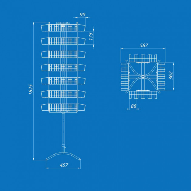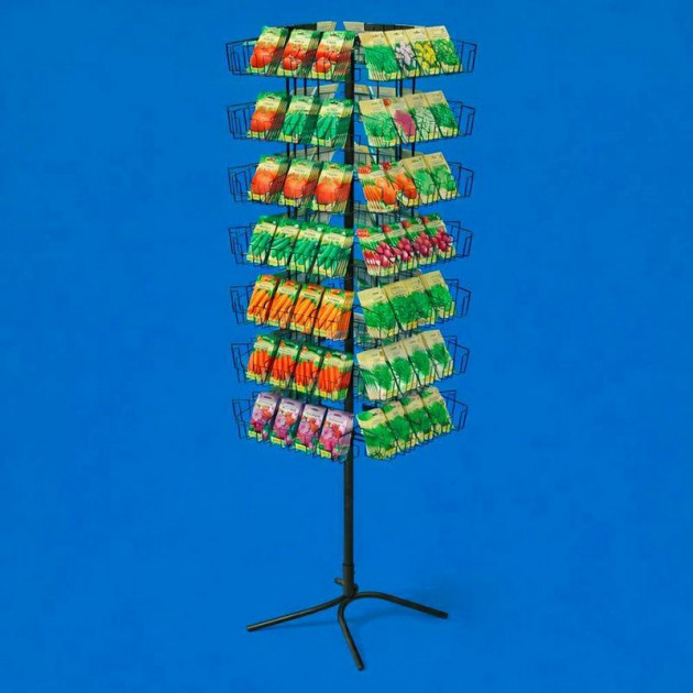 Поворотна підлогова стійка — зручне торгове обладнання для демонстрації та продажу пакетованого насіння. Компактна конструкція дозволяє розмістити велику кількість товару, ефективно використовуючи торговельний простір.