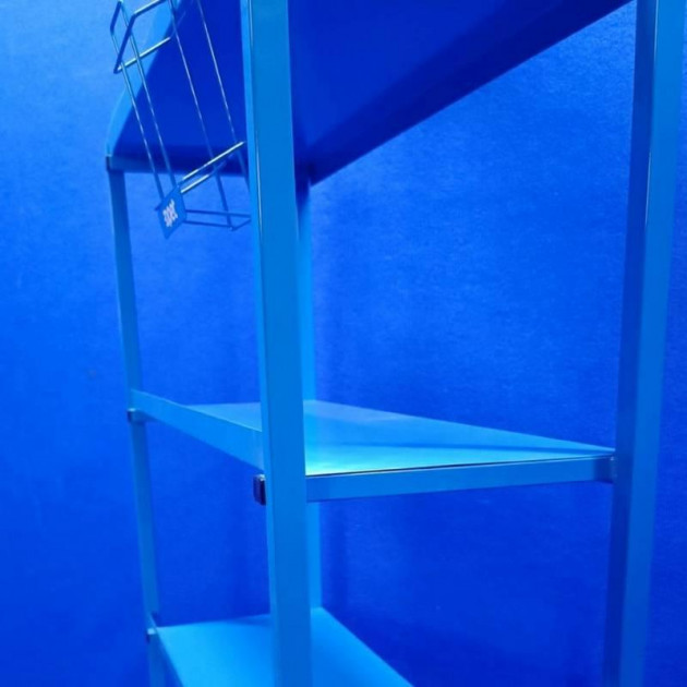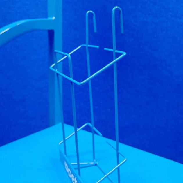 Металевий синій стелаж для автомастил з брендуванням і кишенею для візиток